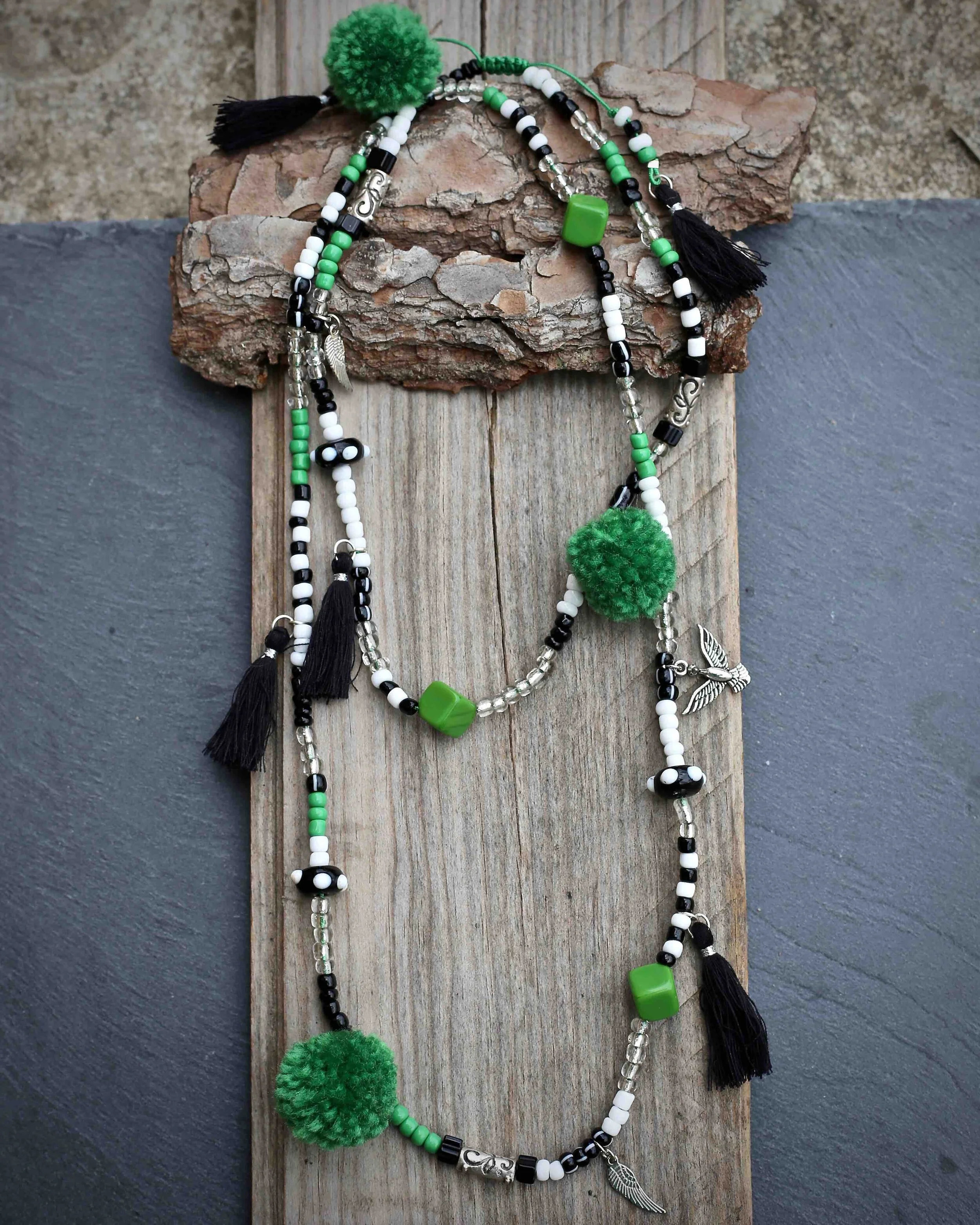 A string of lime green Afghan beads with a fresh water pearl and blue chipped beads.